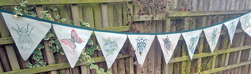 Wimpelketten sollen die Orte unserer Stadtteiltour am 20.6. schmücken. Mit unseren großen Insekten-Folien kannst du auf vorhandene Stoffwimpel drucken. Brigitte und Ulja unterstützen dabei. Bring auch gerne Sets, T-Shirts u.a. mit, auf die du dein Lieblings-Insekt drucken möchtest.