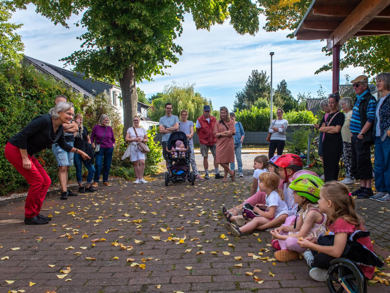An einem sonnigen Mainachmittag machten sich etwa 20 Personen auf den Weg durch Stöckheim, um den Geschichten aus der Schreibwerkstatt "Häuser im Quartier - was flattert hier?" zu lauschen. Vorgetragen von den Autorinnen und Autoren. Zum Abschluss genoss man Vogelwein im Pavillon und lauschte der Geschichte vom Weghaus.