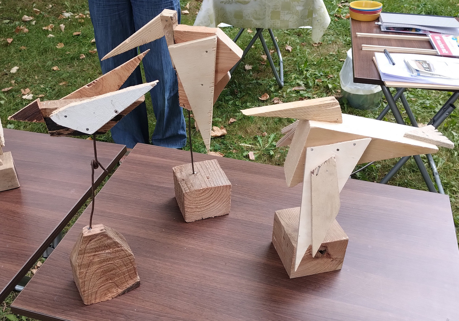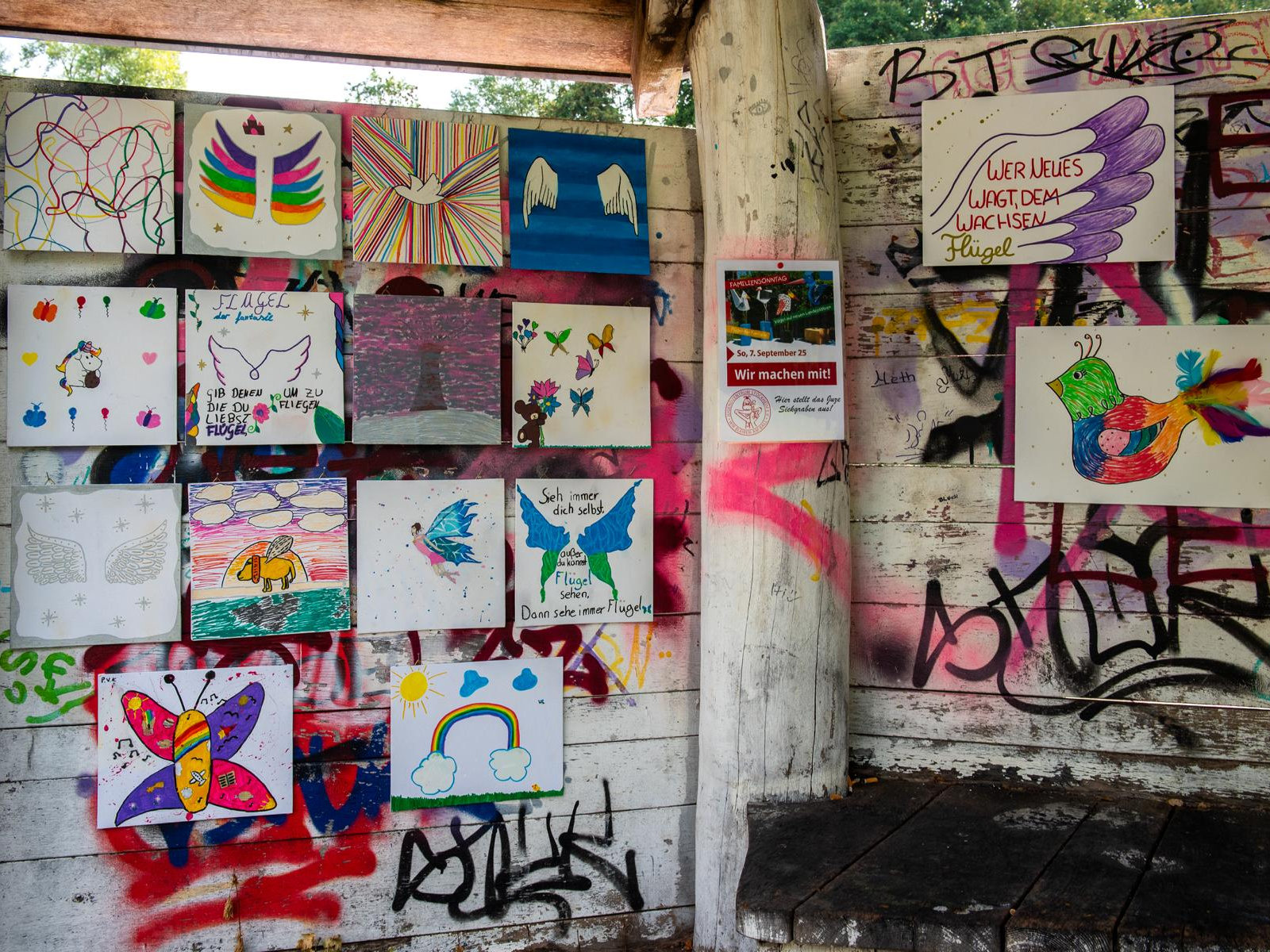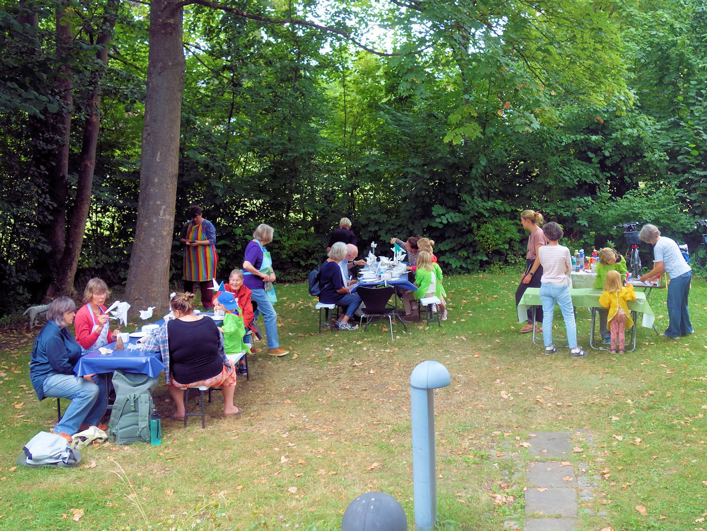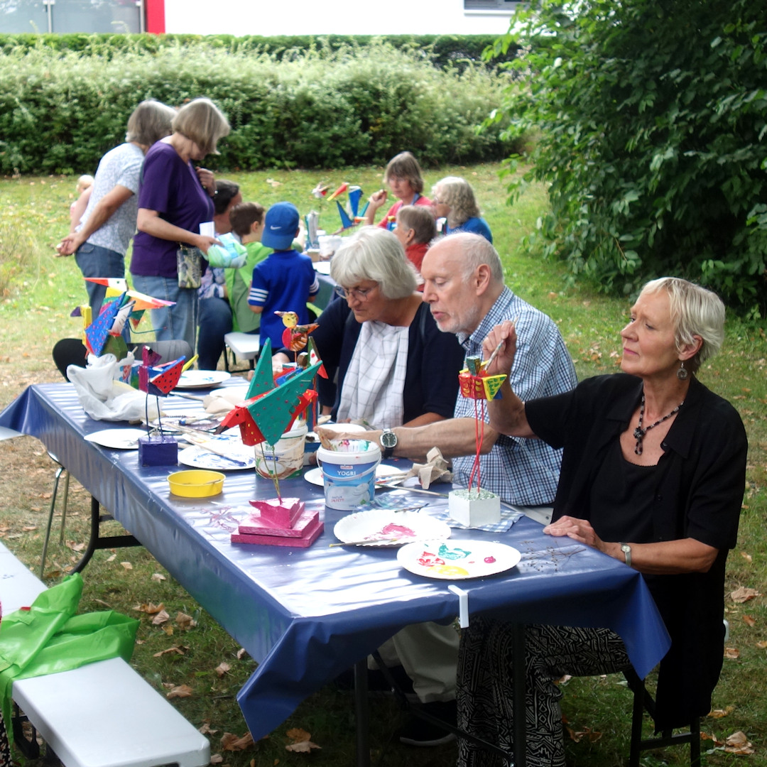 Die Ergebnisse der Workshops Malen und Filzen ("Flügel der Fantasie") und Gel-Druck ("Flügelinos drucken") wurden am Sonntag, den 29.6.2025 im Pavillon präsentiert. Bei bestem Sommerwetter gab es draußen auch Kaffee und Kuchen und reichlich Gelgenheit für ein Schwätzchen.