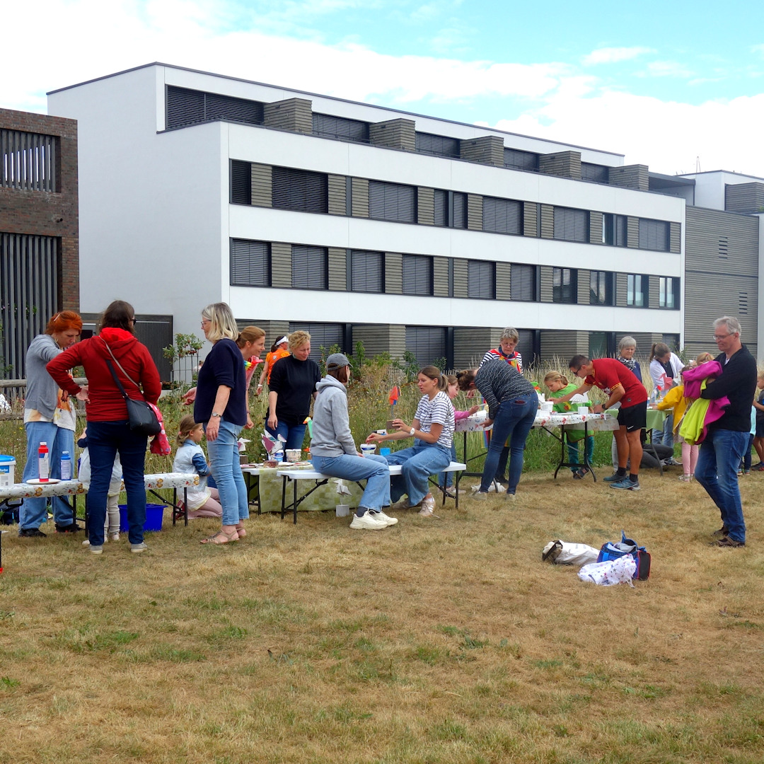 Bei bestem Wetter fanden sich zum ersten Maltermin auf dem neuen Spielplatz "Schiefer Berg" zahlreiche malfreudige Menschen, Familien und Interessierte ein. Alle hatten viel Spaß - auch dank der fachkundigen Anleitung der Künstlerinnen Daria Bonet und Jule Vowinckel.