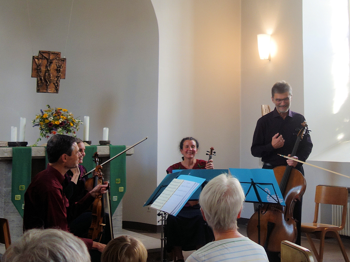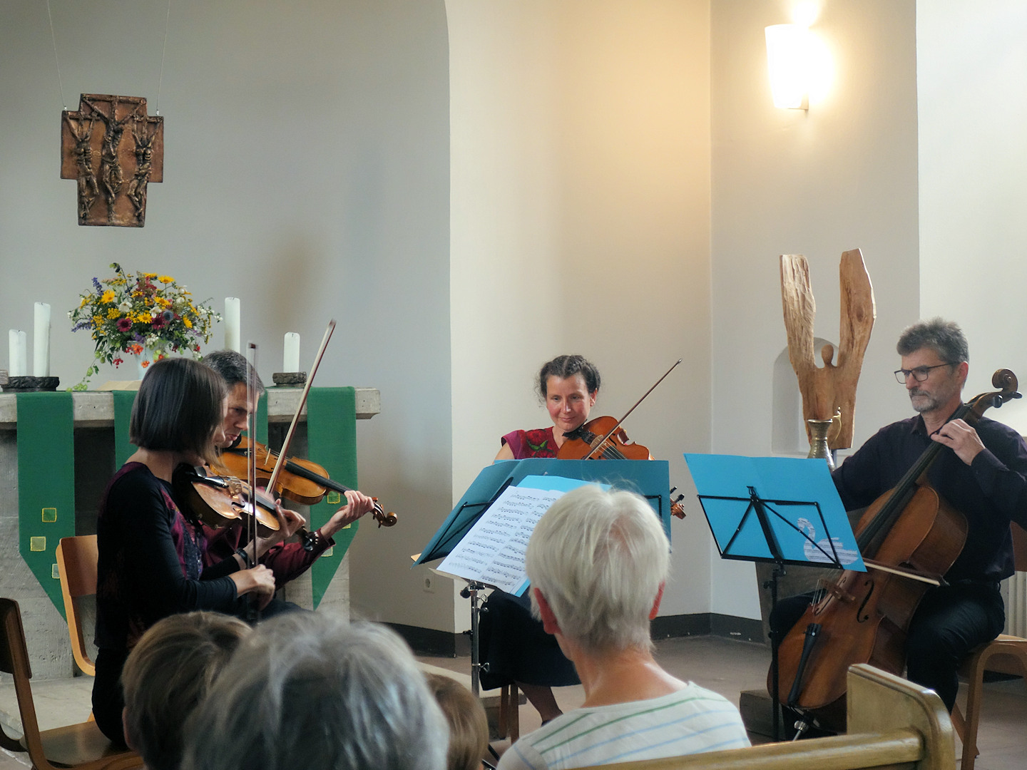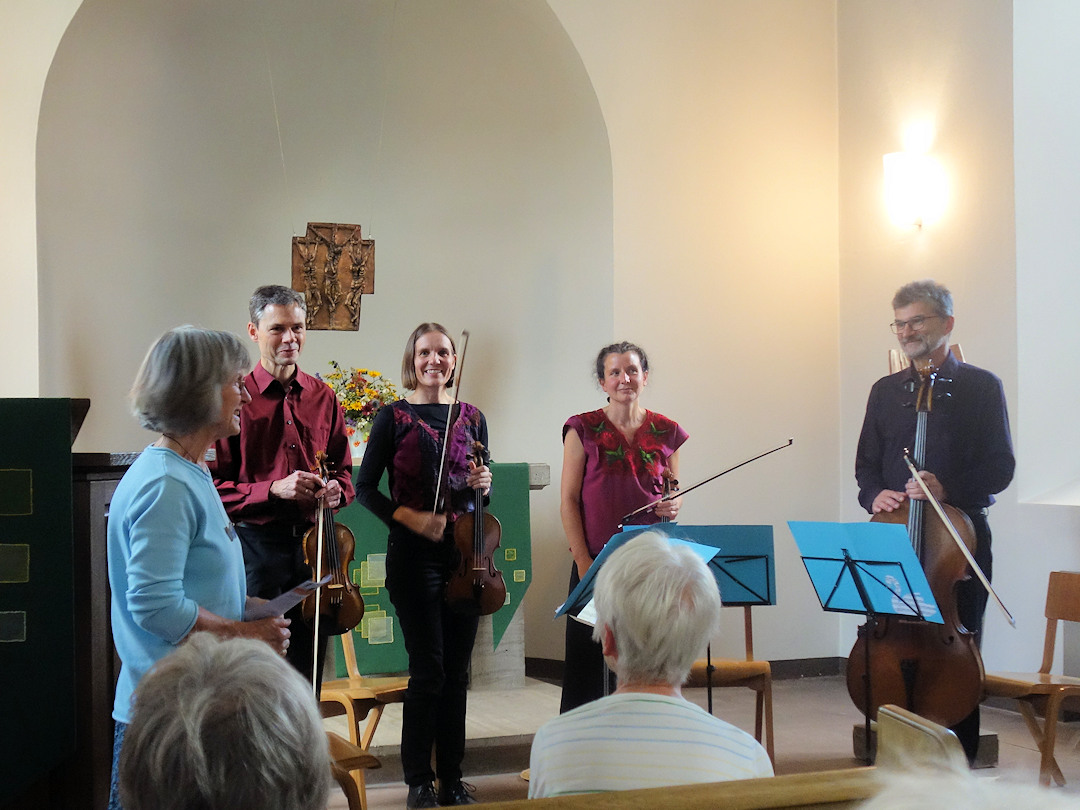 Die vier MusikerInnen Harm und Christiane Pralle an der Violine, Thomas Elfrath am Violoncello und Catharina Don an der Viola begeisterten rund 70 Besucher in der evangelischen Kirche in Stöckheim am Samstag, den 30.8.25.