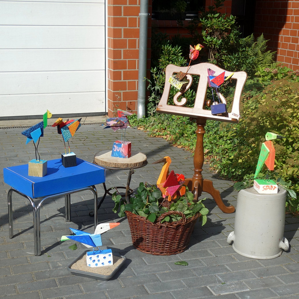 Am 27. März trafen sich sieben Schreibfreudige im Pavillon. Fotos von Häusern und Orten in Stöckheim hatte Brigitte Vaupel ebenso vorbereitet wie etliche Gegenstände mit Vogelbezug. Die Idee: Jemand ist in ein Haus eingezogen und erhält ein Geschenk. Es entstanden vor Ort sechs Geschichten, die mit weiteren am 8. Mai bei einem Stadtteilspaziergang vorgestellt werden.